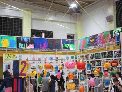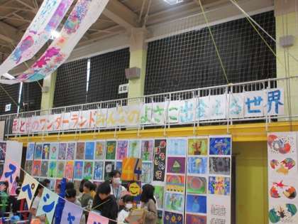 体育館ギャラリーの柵にも、子どもたちの作品があります。