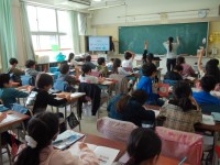 作品の前で腰を下ろし、1年生と同じ目線の高さでいっしょに鑑賞しています。