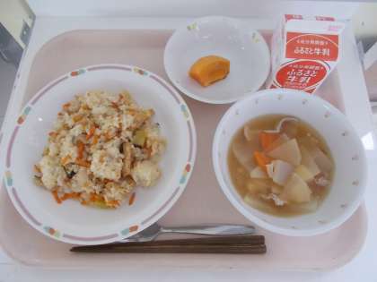 秋の混ぜご飯 豚汁 柿 牛乳