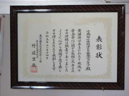 先日東京都から、「千歳台安全ボランティア」の活動が認められ表彰状をいただきました。