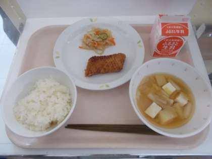 ごはん(有機米 粒すけ) いかの竜田揚げ じゃこサラダ 野菜の味噌汁 牛乳