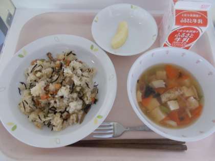 カリカリお豆のひじきごはん 吉野汁 りんご 牛乳