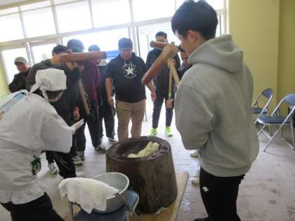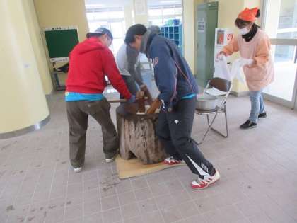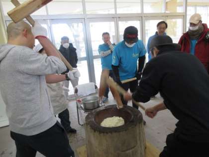 今回の餅つきは、こんな時にいつも頼りになるデバンデスの皆さんと、日大学生寮の学生さんたちです。子ども達が待っているお餅が、次から次へと、突きあがります。