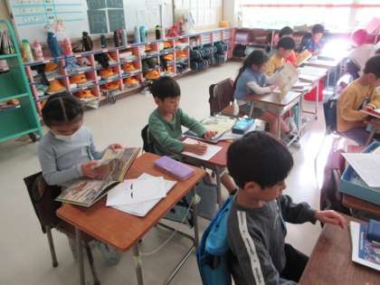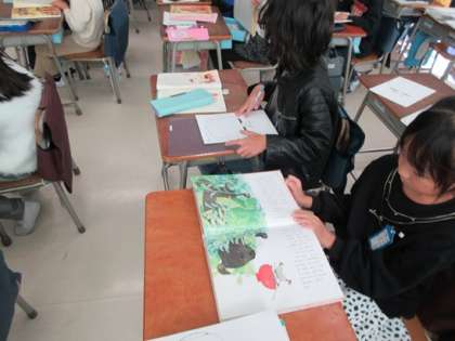 絵本を読み、友だちに本を紹介するカードを作成しています。