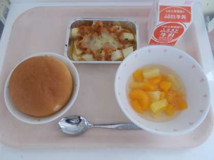 丸パン じゃがいものミートグラタン フルーツポンチ 牛乳
