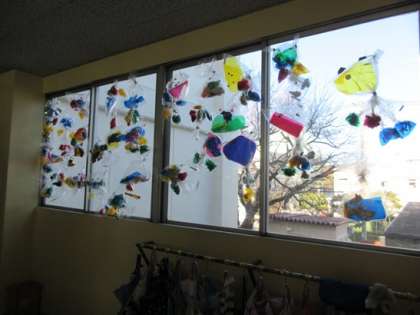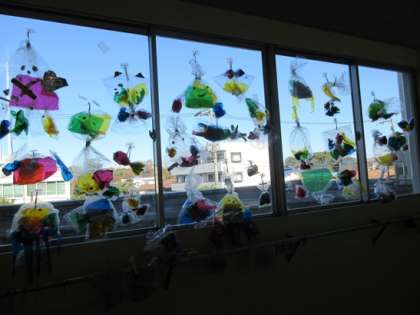 1年生の教室前です。ビニル袋とカラーセロファンで作った作品です。