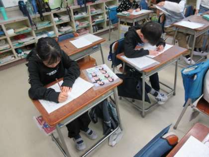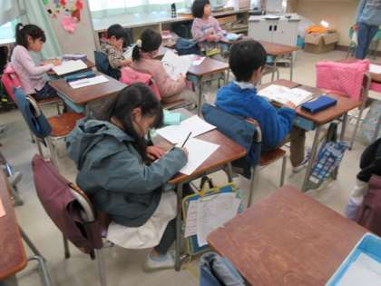 お手本を見ながら、一文字一文字丁寧に書いています。