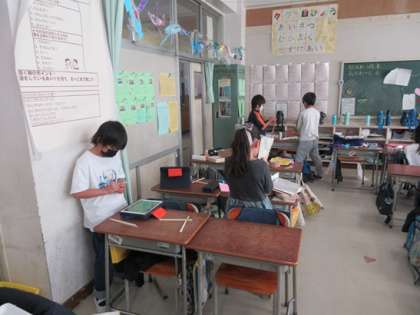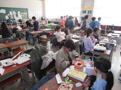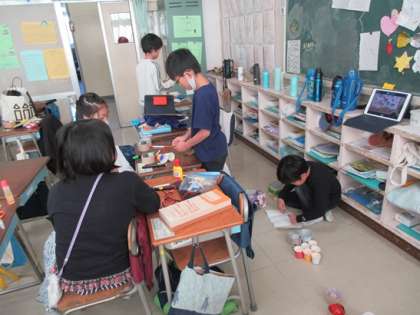 2学期のお楽しみ会をするのでしょうか。いろいろな材料を工夫したゲームを作っています。