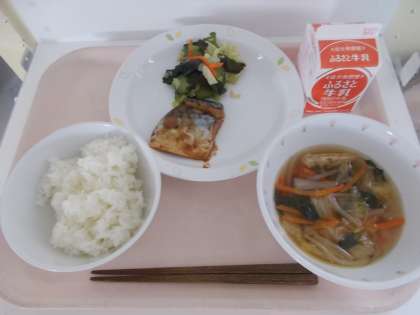 ごはん サバのみそ煮 わかめサラダ 野菜のすまし汁 牛乳