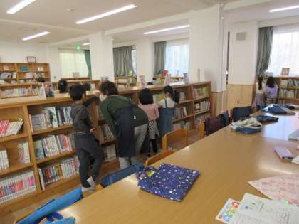 初めて使う新しい図書室です。本棚の前が広くて、選びやすそうです。