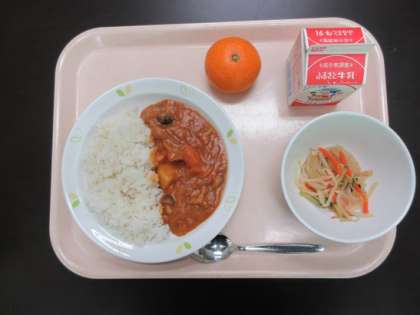 ハッシュドポークライス こんにゃくサラダ みかん 牛乳