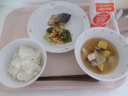 ごはん 魚の一味焼き 和風サラダ さつま汁 牛乳