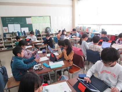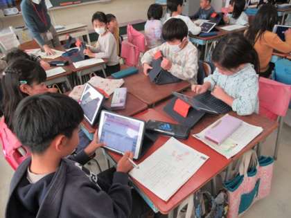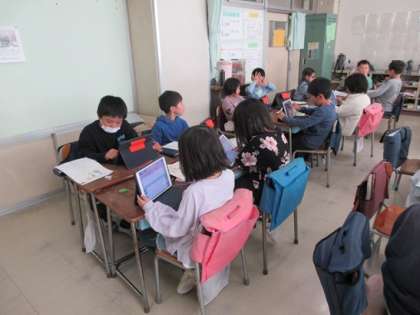 自分で考えたお話を、友だち同士で読みあいました。面白かったところなどの感想を伝ええています。