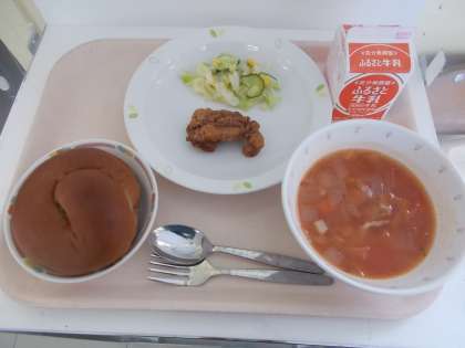 ココアパン フライドチキン コーン入りフレンチサラダ お星さま入りミネストローネ