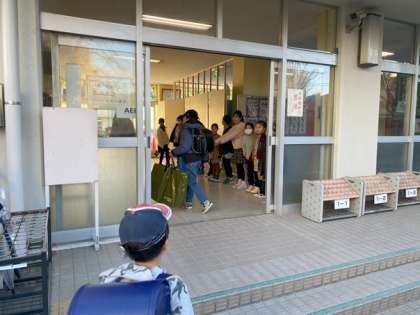 今日は昇降口内には3年3組の子ども達が立ちました。