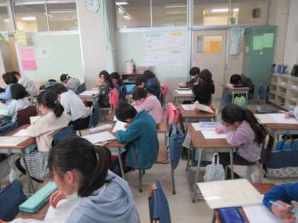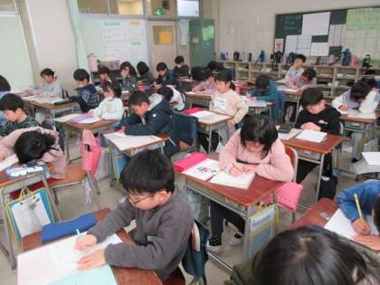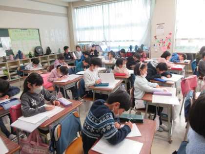 キャリアパスポートを開き、3学期のめあてを記入しています。
