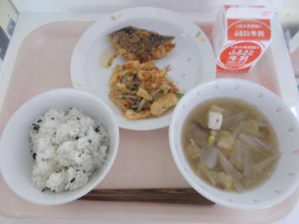わかめご飯 魚の東煮 カリカリ油揚げと野菜のひたし スキー汁 牛乳