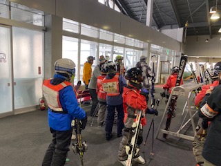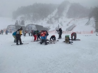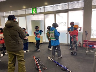 今日も雪です。ゲレンデと室内それぞれで準備運動です。