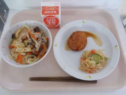 肉うどん いももち じゃこサラダ 牛乳