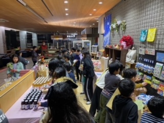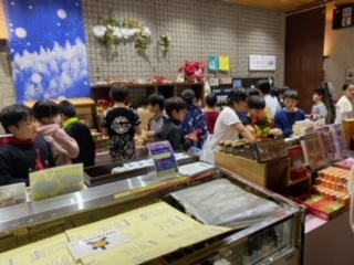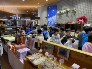 ビレッジに戻り、お風呂の時間と合わせて、お土産購入の時間です。品物を慎重に選んでいます。