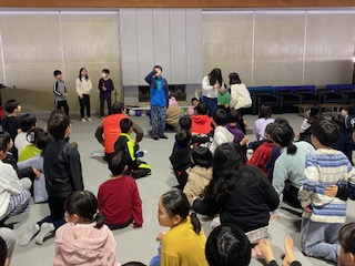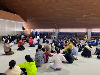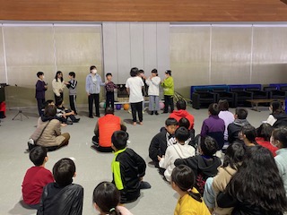 村の会堂での室内レクの時間です。指導員・看護師の先生を審査員にジェスチャー大会です。子ども達のアイデアが光ります。