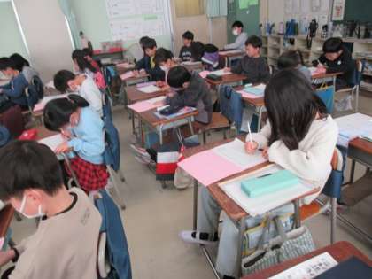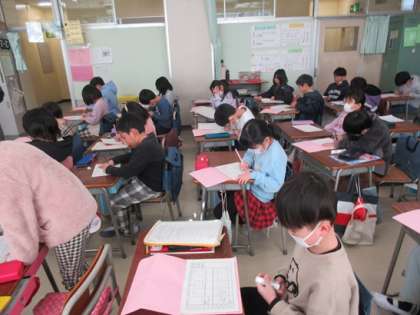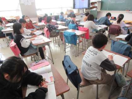 2年1組を覗くと、ピンクの色画用紙に習予定表を貼っています。