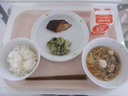 ごはん ぶりのみそ焼き 青のり粉ふきいも 沢煮碗 牛乳