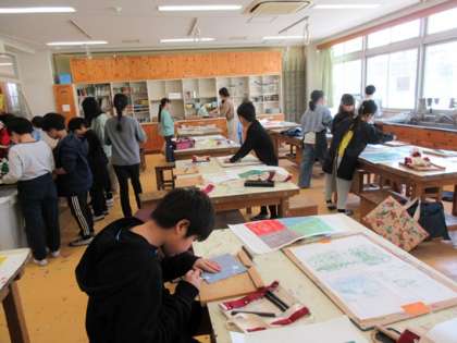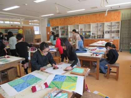 彫り終わった版に、絵の具を塗り、転写していきます。