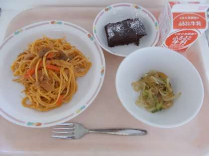 スパゲティナポリタン 大根サラダ チョコブラウニー 牛乳