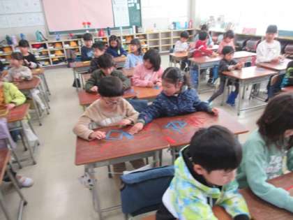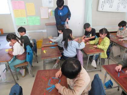 3色の棒を並べて、三角や四角を作り、大きな形を作っています。