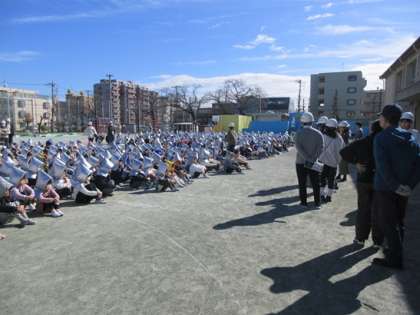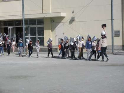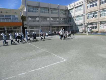 給食が終わり、片づけや簡単清掃をしているときの避難訓練です。