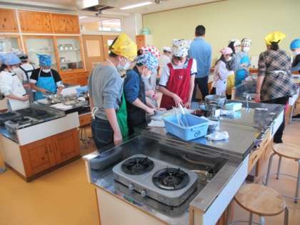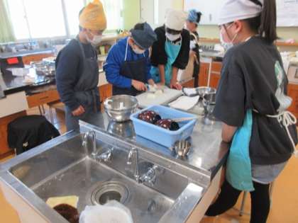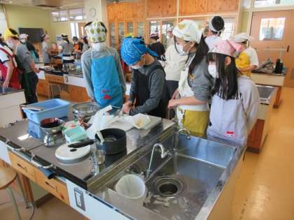 みそ汁の調理実習です。みそ汁に入れる具材を切っていました。