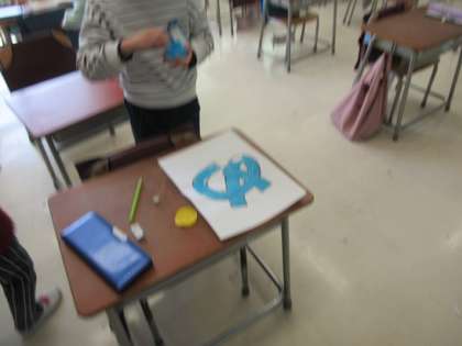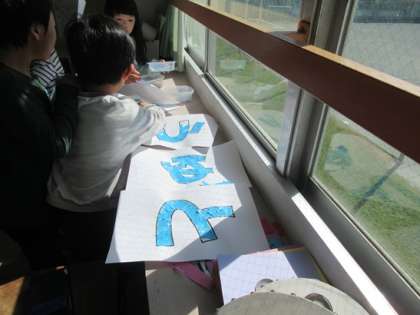 1年3組行くと、大きなひらがなに色がみを張り付けています。