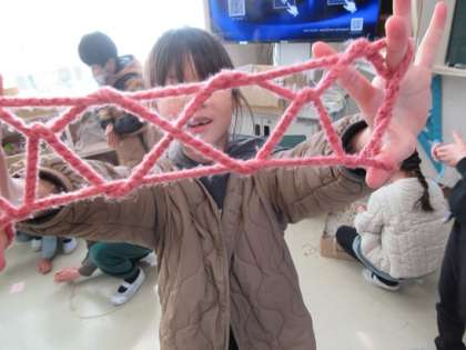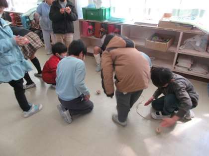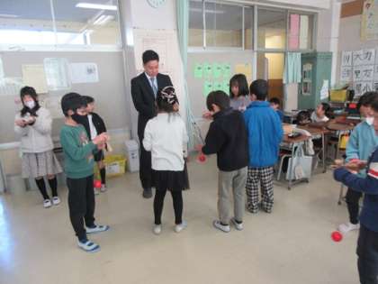 2年2組の子ども達が、けん玉やコマなどで遊んでいます。