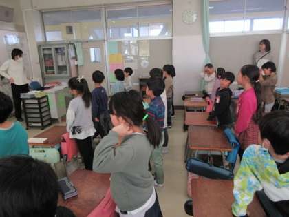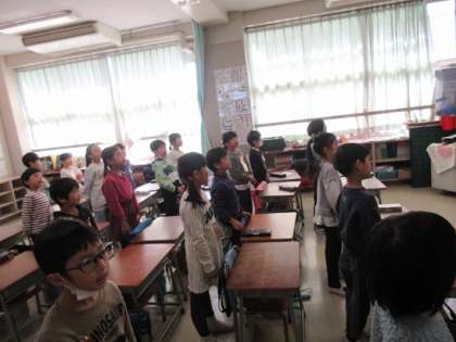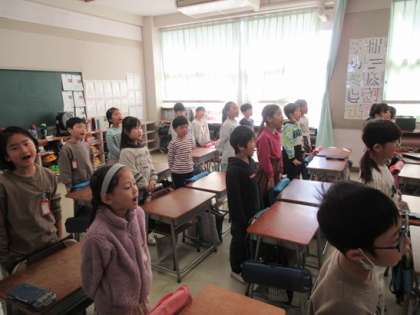 1年1組では、入学式で流す歓迎の歌の練習をしていました。