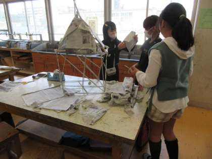 新聞紙を細く丸めてパイプのように使い、形を作っています。