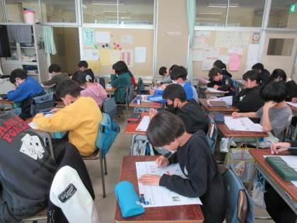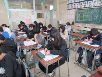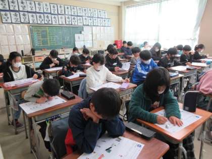 英語の問題文を聴き、答えを書きます。簡単な英文ですが、集中して聴き取ります。
