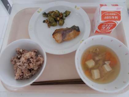 赤飯 ブリの西京焼き 豆じゃが磯和え お祝いすまし汁 牛乳