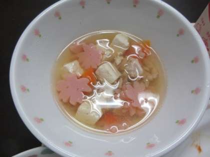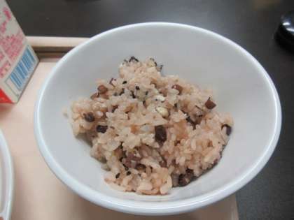 お祝いに欠かせないのがお赤飯ですね。澄まし汁には、桜の花びらをかたどった、練り物が入っていました。春を感じる献立でした。