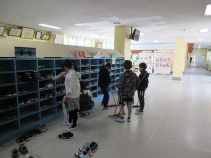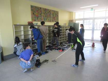 昇降口の清掃の様子です。靴箱の中と床をきれいにしています。