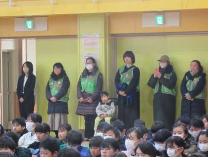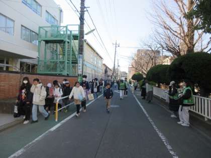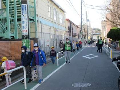緑のベストの皆さんに送られ、元気に通った1年が終わります。