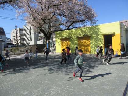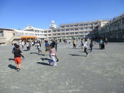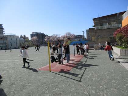 桜の花もまだまだ見ごろの中、校庭いっぱいに使って体を動かしました。