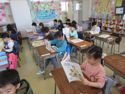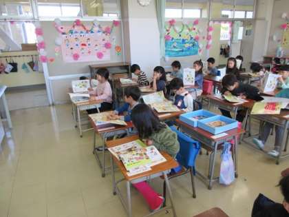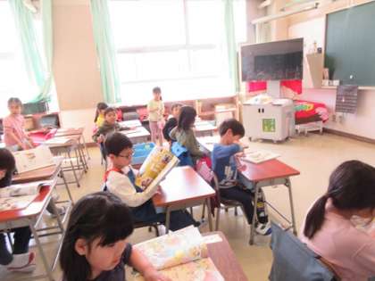 校庭を探検してきた後、大きな生活の教科書を広げています。