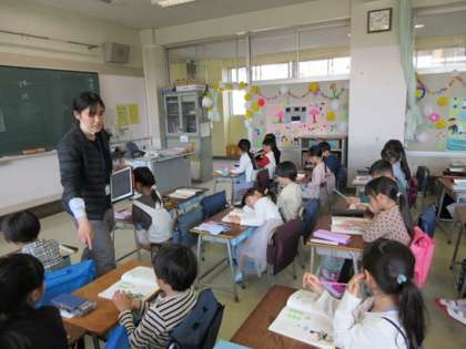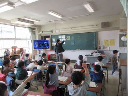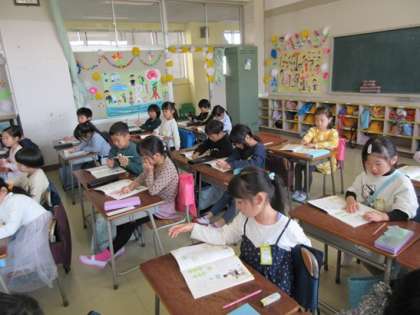 国語の教科書に描かれている、縦、横の直線や曲線に合わせて指でなぞったり、空書きをしたりしています。先生の動きをよく見ています。