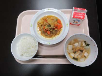 ごはん カレー肉じゃが わかめととうふのみそ汁 牛乳