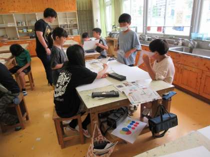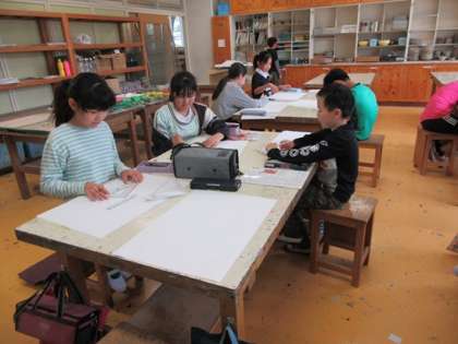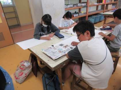 大きな画用紙を前に、物差しや定規を使い、絵を描いていくようです。