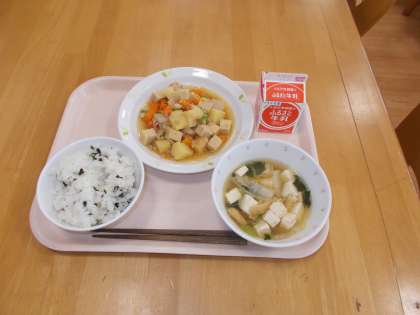 わかめごはん じゃが芋のそぼろ煮 白菜のすまし汁 牛乳