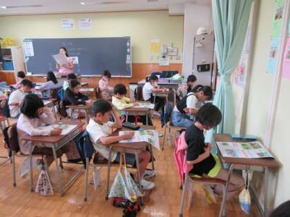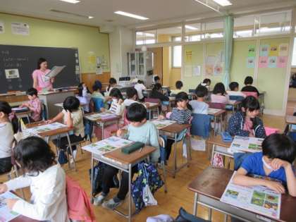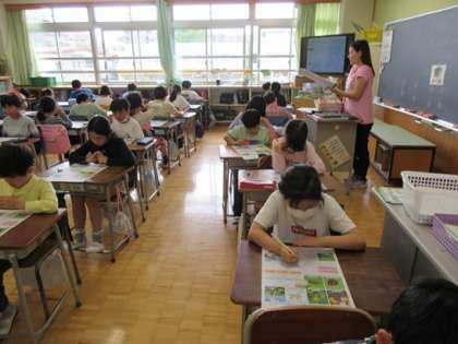 テストの時間でした。問題文に沿った答えが書けるよう、一問一問、先生が問題を読み、説明をしています。