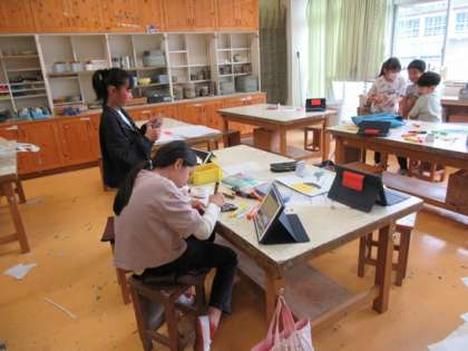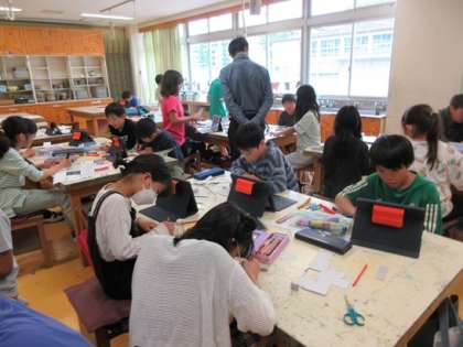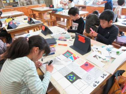 タブレットを使い、様々なカードのデザインを参考に、マイカードを作っていました。