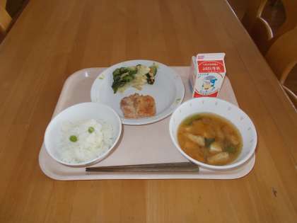 グリーンピースごはん 鶏肉の照り焼き わかめサラダ じゃが芋のみそ汁 牛乳